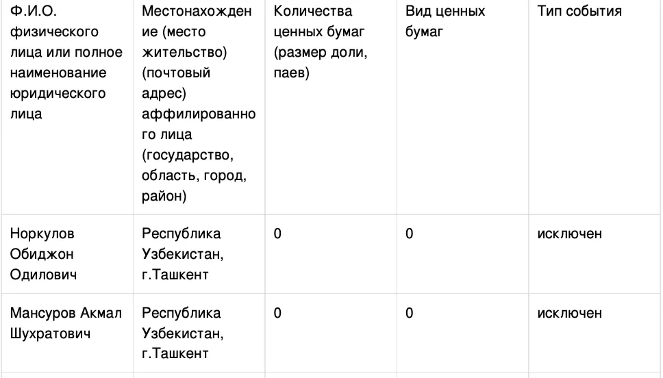 Демак, улар эгаллаб турган раис ўринбосари лавозимларидан озод этилган бўлиши мумкин. Аффилланган шахслар рўйхатидаги бундай ўзгариш одатда банкдаги кадрлар алмашинувининг расмий ва ҳуқуқий тасдиғи ҳисобланади.