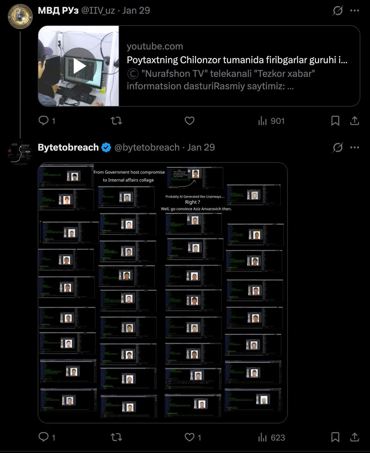 Мазкур хакер ByteToBreach номи билан танилган бўлиб, 2025 йил июнь ойидан буён фаолият юритиб келади. У Reddit форумларида Ўзбекистон фуқароларига оид маълумотлар сизиб чиққани ҳақидаги хабарлар тарқалишидан олти кун аввал Ички ишлар вазирлигининг Х (собиқ Twitter) саҳифасига “Hello ??? Are you guys… Alive?” мазмунидаги изоҳ қолдирган.