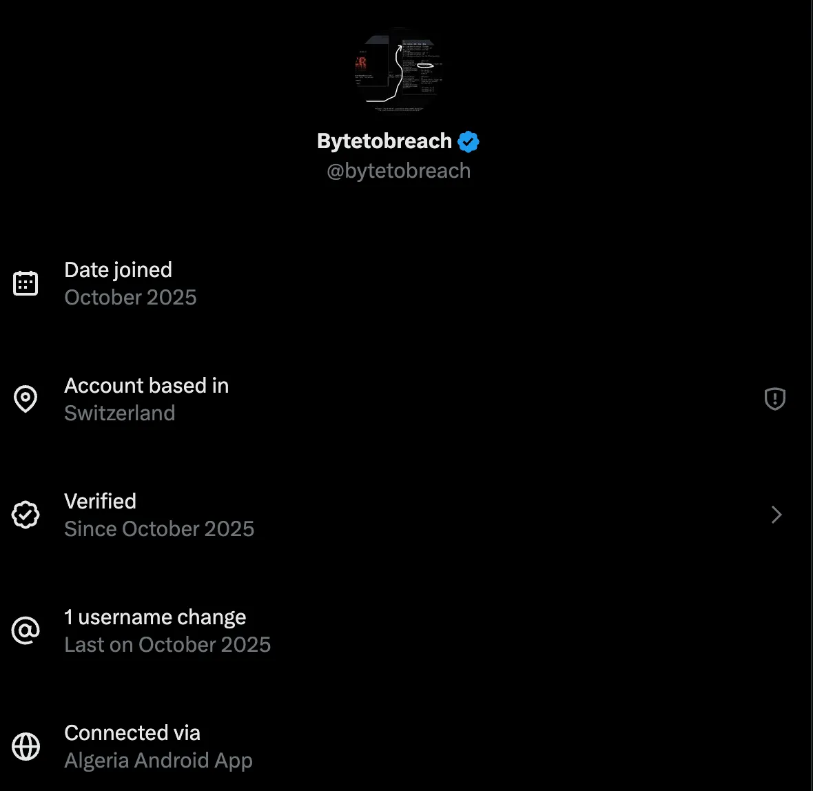 Хакернинг X (собиқ Twitter) тармоғидаги профилида жойлашув сифатида Швейцария кўрсатилган, бироқ бу маълумотнинг ишончлилиги аниқ эмас. Фойдаланувчи уланиши эса Жазоирдаги Android қурилма орқали амалга оширилгани қайд этилган.