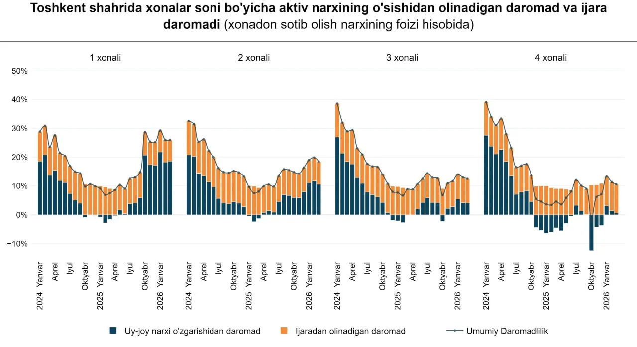 Ижарадан олинадиган барқарор даромад эса ўртача 8,0% атрофида шаклланган. Ижара бозори учун энг жозибадор ҳудудлар сифатида Шайхонтоҳур (9,1%) ва Яшнобод (8,4%) туманлари ажралиб турибди.