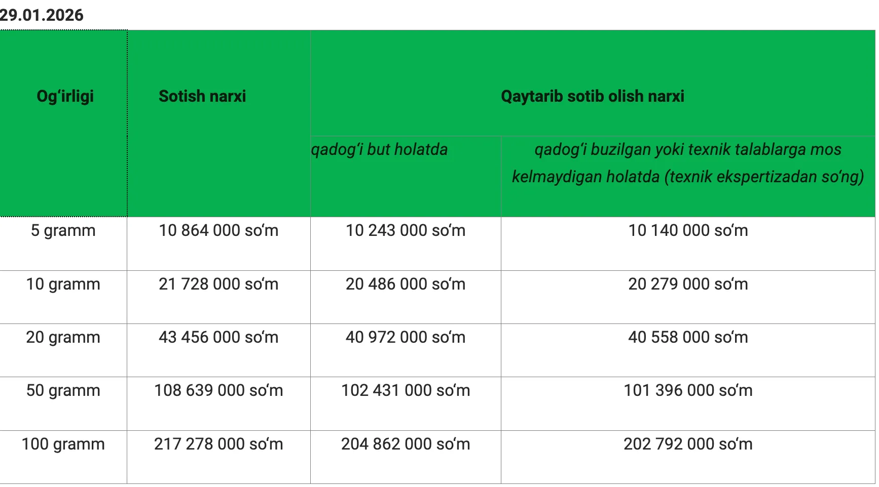 Ўзбекистонда ҳам олтин қуймалари нархи кетма-кет рекордларни янгиламоқда. Айни пайтда бир грамм олтин қуймаси 2 172 780 сўмдан баҳоланмоқда. Беш граммлик олтин қуймаси нархи эса илк бор 10,8 миллион сўмдан ошди. Бир кун ичида маҳаллий бозорда нархлар қарийб 5,5 фоизга ўсди.