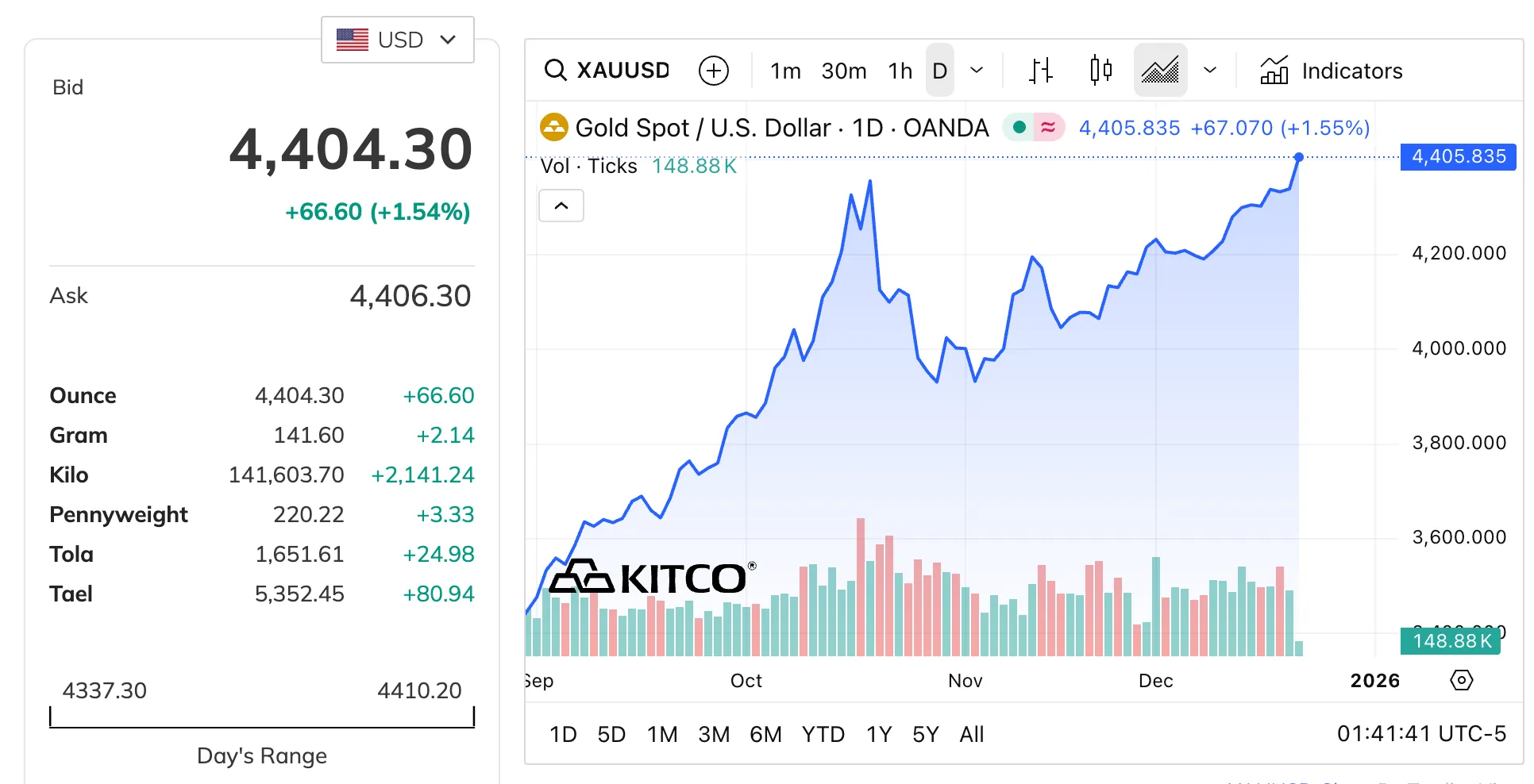 Савдолар давомида қимматбаҳо металлнинг бир унцияси 4 410 долларгача кўтарилиб, тарихда илк бор 4 400 доллар чегарасидан ошди. Бир кун ичида олтин нархи 1,5 фоизга ёки 66,6 долларга қимматлашди.