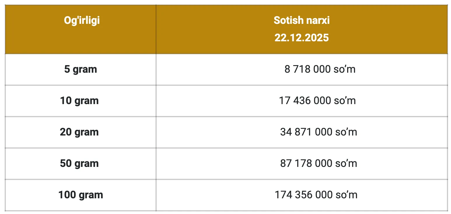 Ўзбекистонда Марказий банк томонидан чиқарилган олтин қуймалари нархи ҳозирда қуйидагича: