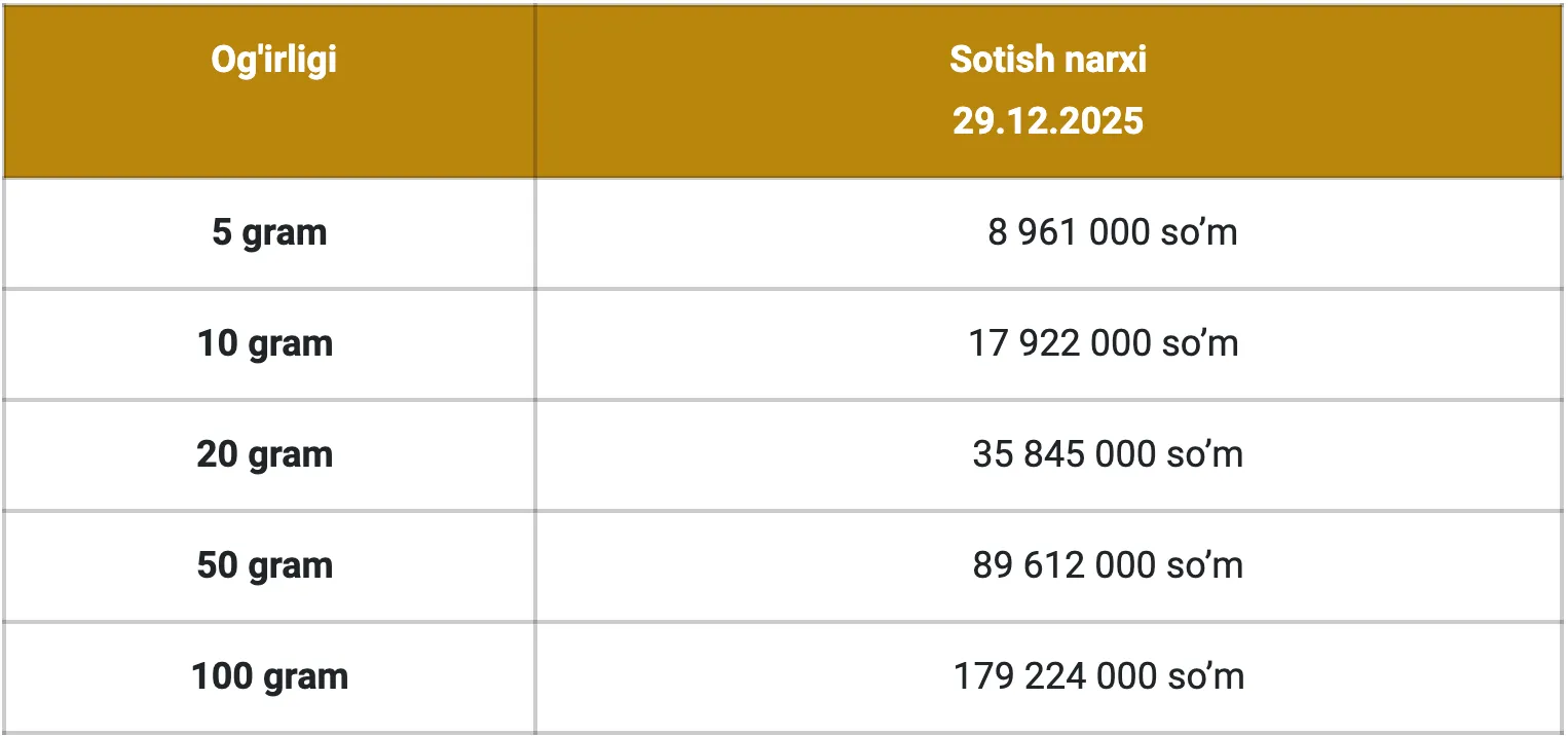 Айни пайтда 1 грамм олтин 1 млн 792 минг 240 сўмга тенг бўлиб, йил бошидан буён нархлар 58,3 фоизга ошган. Шу билан бирга, жаҳон бозорида олтин нархи қисқа муддатда 4 550 долларгача кўтарилиб, кейин коррекция туфайли 4 470 долларга пасайди.