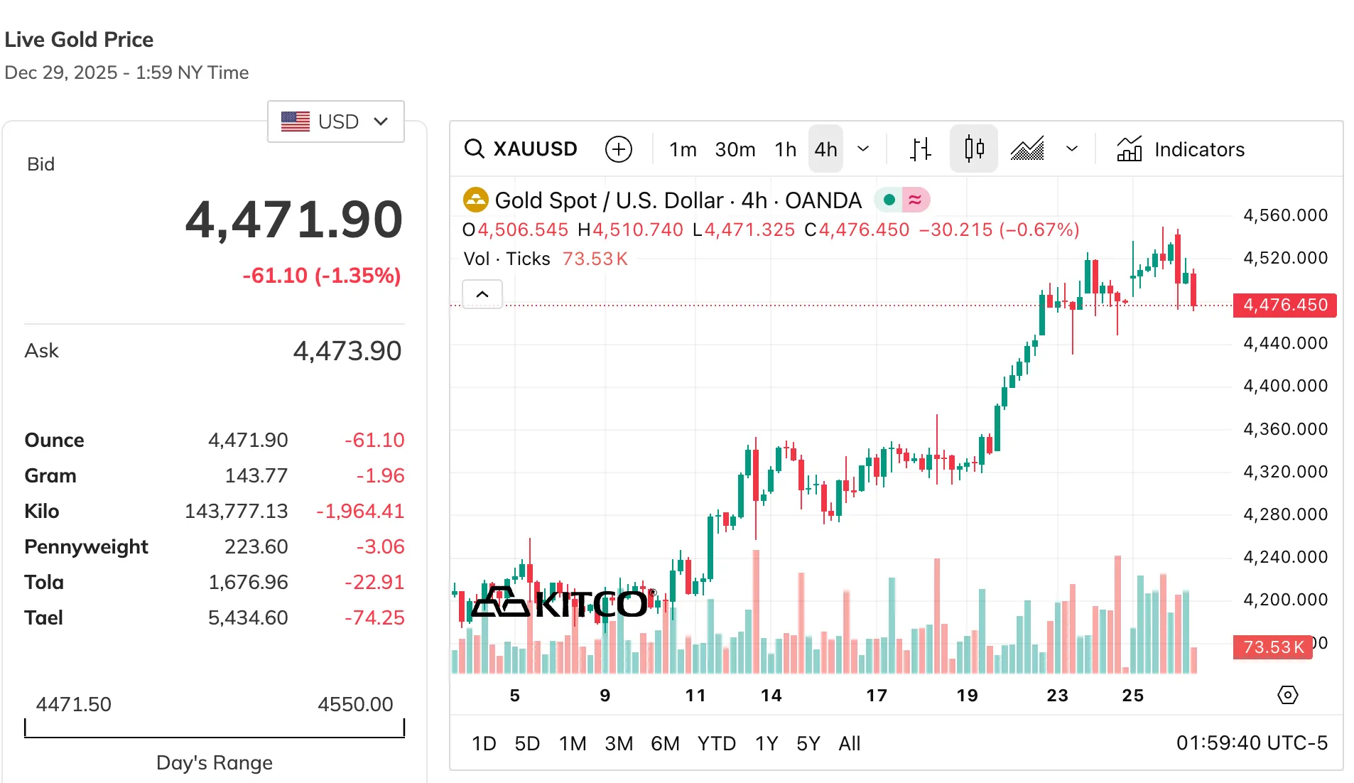 Жаҳон бозорида эса вазият ўзгарувчан. 29 декабрь куни савдолар давомида олтин нархи бир муддат 4 550 долларгача кўтарилди. Бироқ, шундан сўнг нархлар коррекцияси (тузатилиш) кузатилиб, хабар тайёрланаётган вақтда қимматбаҳо металл нархи 4 471 долларгача пасайди.