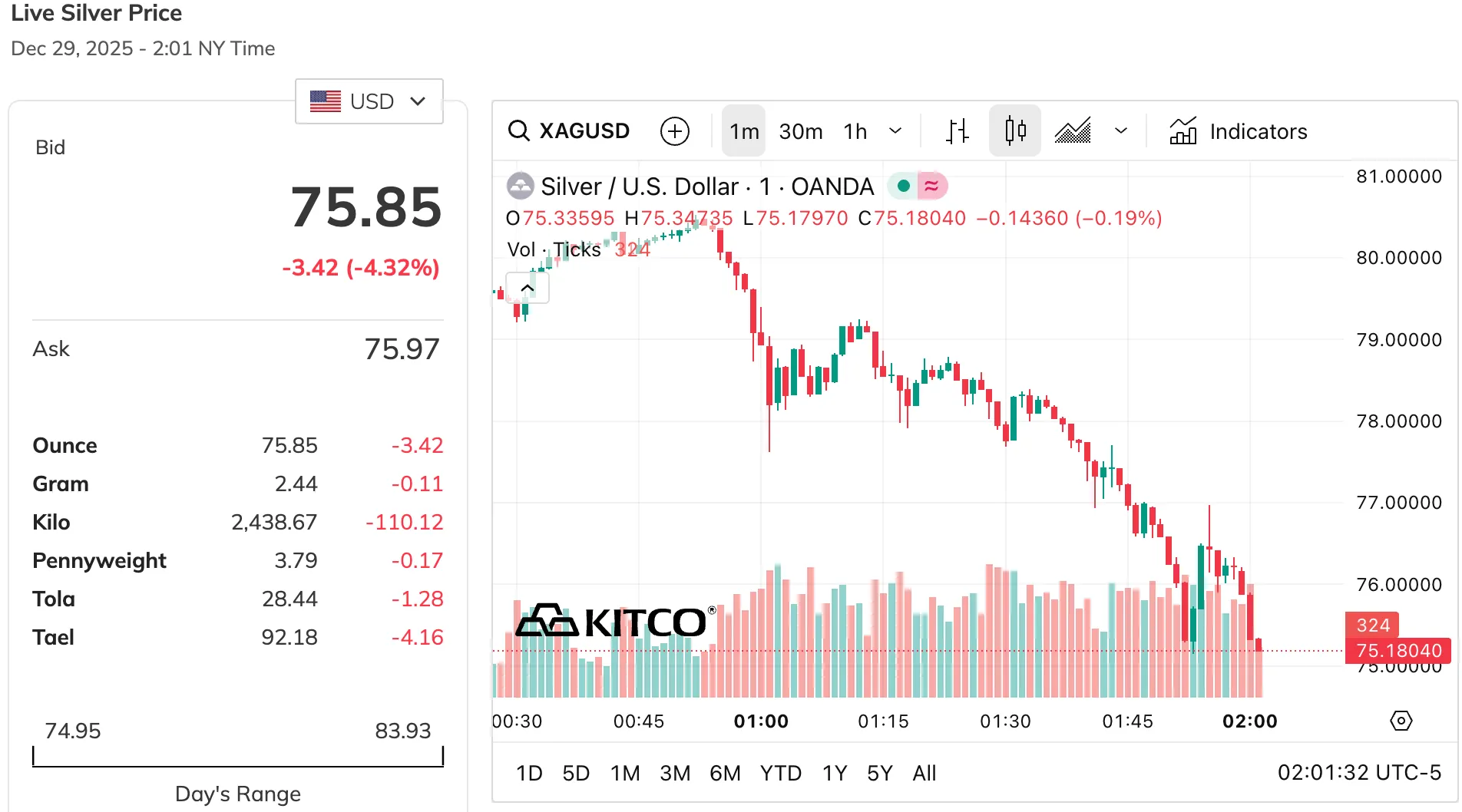 Кумуш бозорида ҳам шунга ўхшаш ҳолат қайд этилди: нархлар аввалига 83,93 долларгача кўтарилган бўлса-да, кейинчалик савдолар жараёнида 75,85 долларгача арзонлашди.