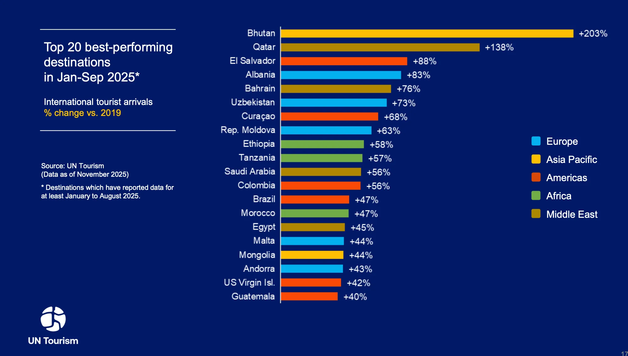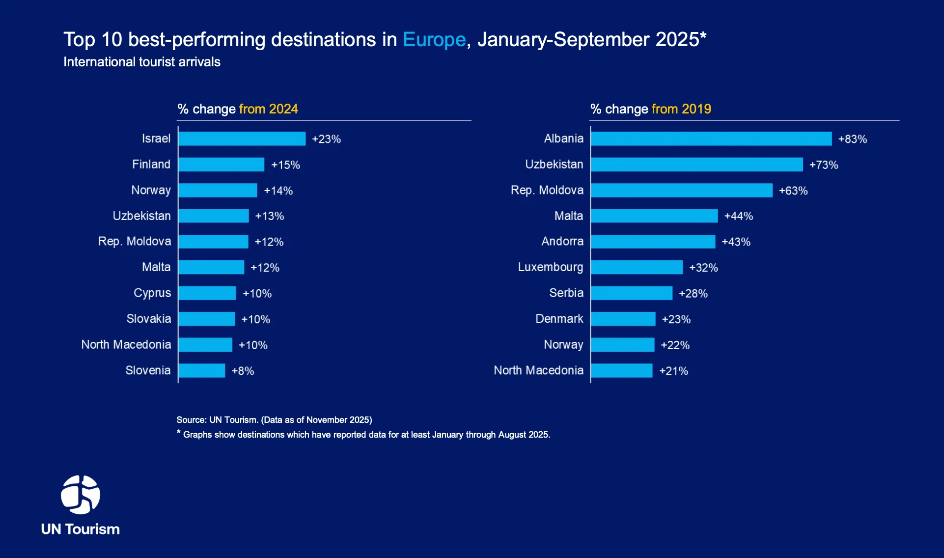 2025 йилнинг январь–сентябрь ойларида Ўзбекистонга келган халқаро туристлар сони 2019 йилга нисбатан 73 фоизга ошди. Ушбу кўрсаткич билан мамлакат дунё миқёсида энг тез ўсаётган сайёҳлик йўналишлари орасида 6-ўринни эгаллади. Ўзбекистон шунингдек Европада энг юқори ўсиш қайд этилган давлатлар қаторидан жой олди.