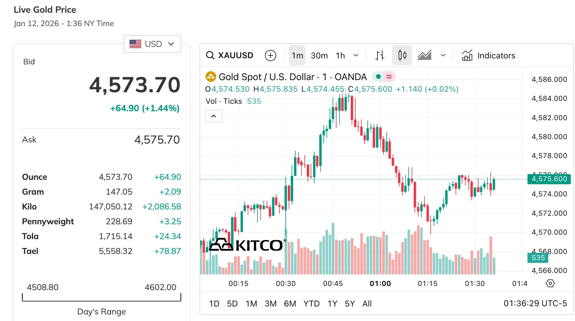 Жаҳон бозорида ҳам олтин нархи тарихий рекордларни янгиламоқда. Бир унция олтин нархи 4 600 долларгача кўтарилди. Хабар тайёрланаётган пайтда қимматбаҳо металл 4 573 доллар атрофида савдо қилинмоқда.