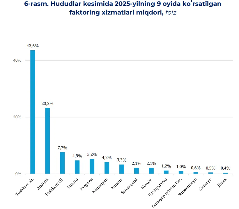 Ҳудудлар кесимида факторинг хизматлари асосан Тошкент шаҳри (2,9 трлн сўм ёки 43,6%) ва Андижон вилояти (1,5 трлн сўм ёки 23,2%) ҳиссасига тўғри келган. Шунингдек, Тошкент вилоятида 506 млрд сўм, Фарғонада 345 млрд сўмлик хизматлар қайд этилган.