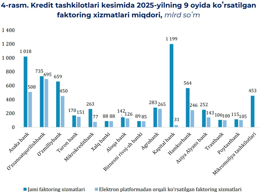 Шунингдек, хусусий банклар орасида факторинг хизматлари бўйича Капиталбанк 1,2 трлн сўм (шундан 31 млрд сўм электрон платформа орқали), Hamkorbank 564 млрд сўм (246 млрд сўм рақамли шаклда) ва Asia Alliance Bank 252 млрд сўм (143 млрд сўм электрон кўринишда) билан етакчилик қилган.
