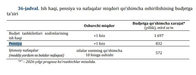 Вазирлик ҳисоб-китобларига кўра, бюджет ходимлари иш ҳақининг ҳар бир 1 фоиз пунктга оширилиши давлат бюджетига 1,67 триллион сўмга тушади. Пенсияларни шу даражада оширишнинг қиймати 861 миллиард сўмдир. Ижтимоий нафақа олувчилар сонининг 10 фоизга кўпайиши бюджет харажатларини 1,6 триллион сўмга оширади.