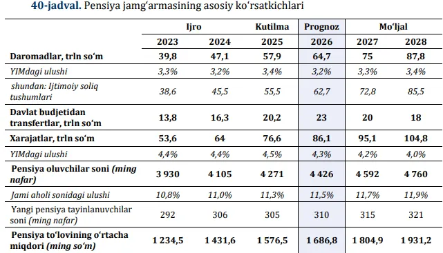 2026 йил бошига Пенсия жамғармасида 3,9 триллион сўмлик қолдиқ шаклланиши, даромадлар 64,7 триллион сўмни, харажатлар эса 86,1 триллион сўмни ташкил этиши прогноз қилинмоқда. Тақчилликни тўлдириш учун бюджетдан 23 триллион сўмлик трансфер ажратилиши режалаштирилган бўлиб, бу ўтган йилга нисбатан 13,8 фоиз кўп.