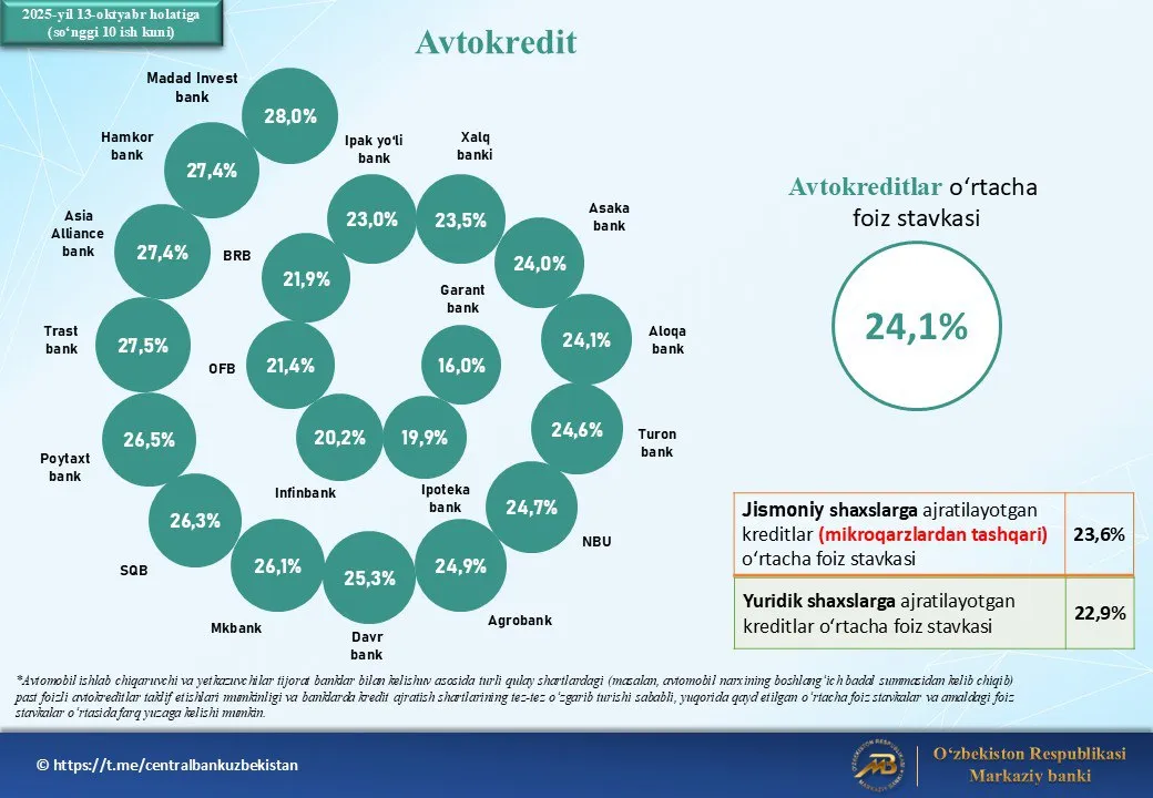 13 октябрь ҳолатига кўра, автокредитлар бўйича ўртача фоиз ставкаси 24,1 фоизни ташкил қилмоқда.