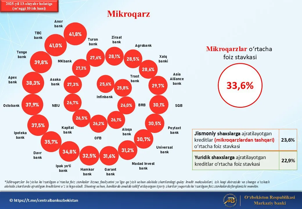 Марказий банк маълумотларига кўра, 2025 йил 13-октабр ҳолатида микроқарзлар бўйича ўртача фоиз ставкаси 33,6 фоизни ташкил этди. Бу маълумотлар эълон қилина бошланганидан бери энг паст даражадир.