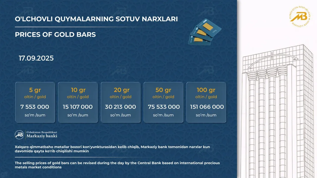 17 сентябрь куни олтин қуймасининг бир грамм нархи 1,51 млн сўмга етиб, йил бошидан буён 30-марта рекорд янгилади. Сўнгги 12 ойда олтин нархи 38 фоиздан кўпроққа ошган.