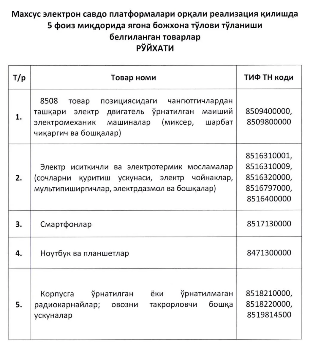 Қарорга мувофиқ, республика ҳудудидан бонд омборларига махсус электрон савдо платформалари орқали чакана сотиш учун мўлжалланган товарларни жойлаштиришга рухсат берилмайди. Фақат республика ҳудудидан ташқарига олиб чиқиш учун мўлжалланган товарлар бундан мустасно ҳисобланади.
