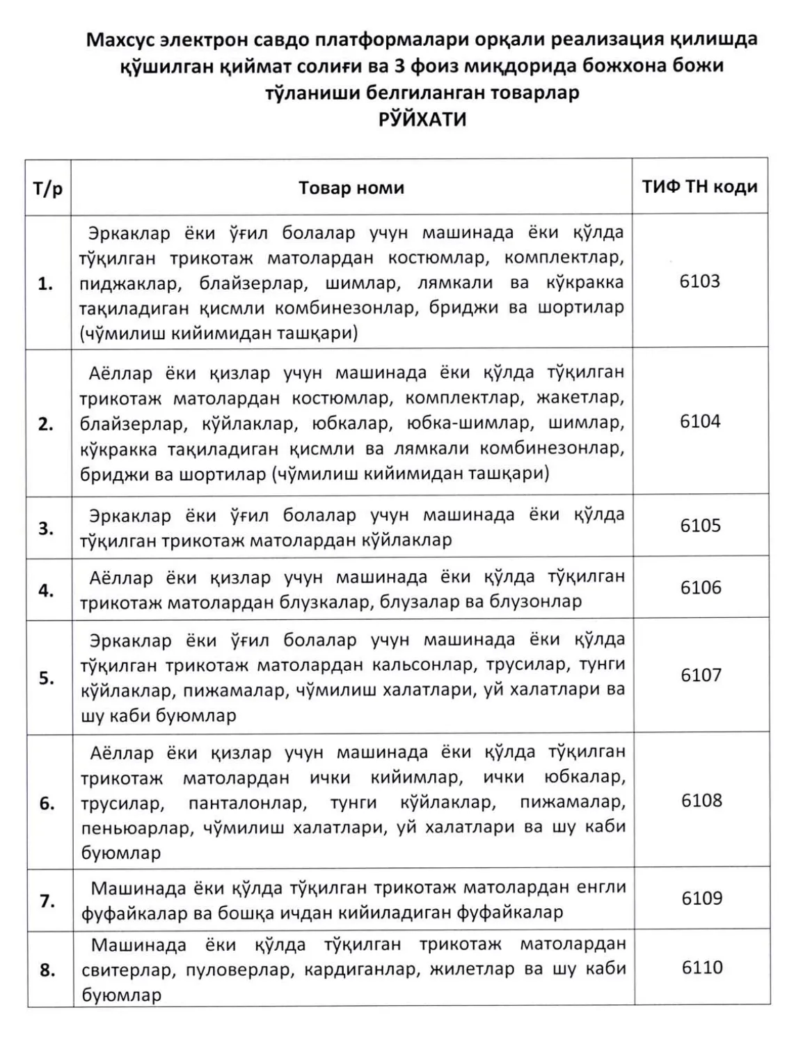 Хусусан, қуйида тоифадаги товарлар жўнатмалар декларацияси асосида жисмоний шахсларга чиқарилганда божхона имтиёзлари қўлланмайди. Бунинг ўрнига амалдаги божхона тўловлари ўрнига уларнинг сотиш қийматидан 5 фоиз миқдорида ягона божхона тўлови ундирилади: