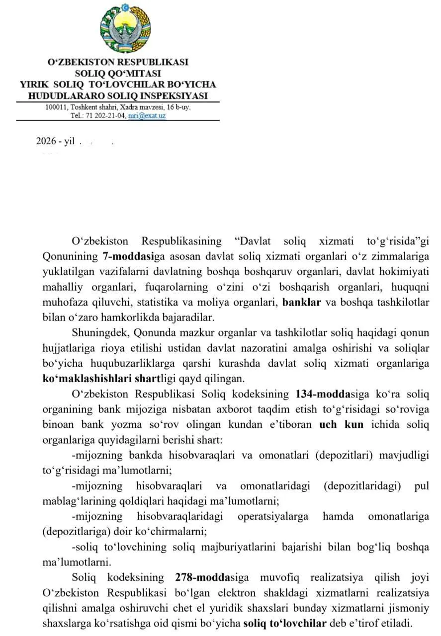 Бундан аввал бир нечта Telegram каналлар ва ОАВда Йирик солиқ тўловчилар бўйича ҳудудлараро давлат солиқ инспекцияси томонидан банкларга юборилган хатларни эълон қилган эди. Идора сўнгги уч йил давомида 83 та хорижий интернет-сервис фойдасига амалга оширилган тўловлар ҳақидаги маълумотларни сўраган.