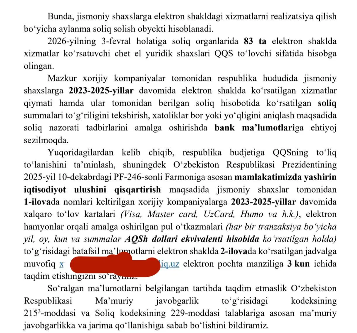 Солиқ органлари мазкур маълумотлар талаби хорижий интернет-сервислар томонидан ҳисоботларда кўрсатилган солиқлар суммаларининг “тўғрилигини текшириш” ва улар томонидан 2023 йилдан буён кўрсатилган хизматлар қийматини баҳолаш зарурати билан изоҳланган. Шунингдек, идора 2025 йил декабрь ойида қабул қилинган “Яширин иқтисодиётга қарши курашиш тўғрисида”ги ПФ-246-сон фармонга ҳам таянмоқда.
