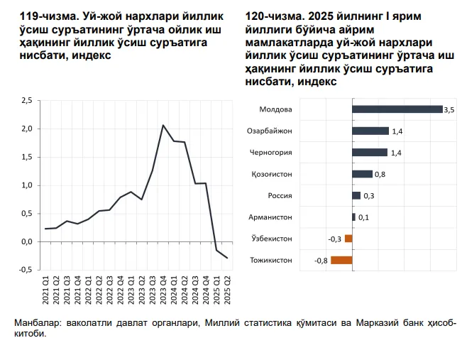 Ўзбекистон уй-жой бозорида сўнгги йилларда илк бор реал барқарорлашув кузатилди. Бозор ва фундаментал нарх ўртасидаги фарқ йил бошидаги 17 фоиздан 4 фоизгача қисқарди, таклиф кескин ошди, спекулятив талаб эса пасайди. Миллий валютада уй нархлари 4,9 фоизга, долларда 6,2 фоизга тушди. Шунингдек, иш ҳақлари 17 фоизга ошиб, уй-жой нархлари билан нисбати манфий даражага (-0,3) кирди.