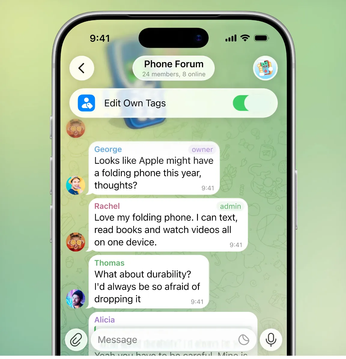 Энди гуруҳ чатлари иштирокчилари ўз исми ёнига тег қўшишлари мумкин. Бу иш жамоадаги лавозим ёки роль, университетдаги мутахассислик ва бошқалар бўлиши мумкин. Масалан, қўшнилар билан суҳбатда квартира ёки машинани кўрсатиш ёки онлайн ҳамжамиятда ўз қизиқишларини билдириш мумкин.