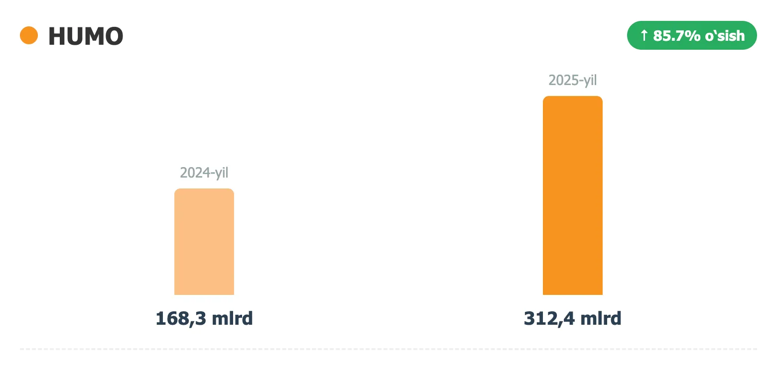 Мазкур даврда HUMO активлари 434,8 млрд сўмдан 714,4 млрд сўмга ошган. Устав капитали эса ўзгаришсиз қолиб, 155,4 млрд сўмни ташкил этган.