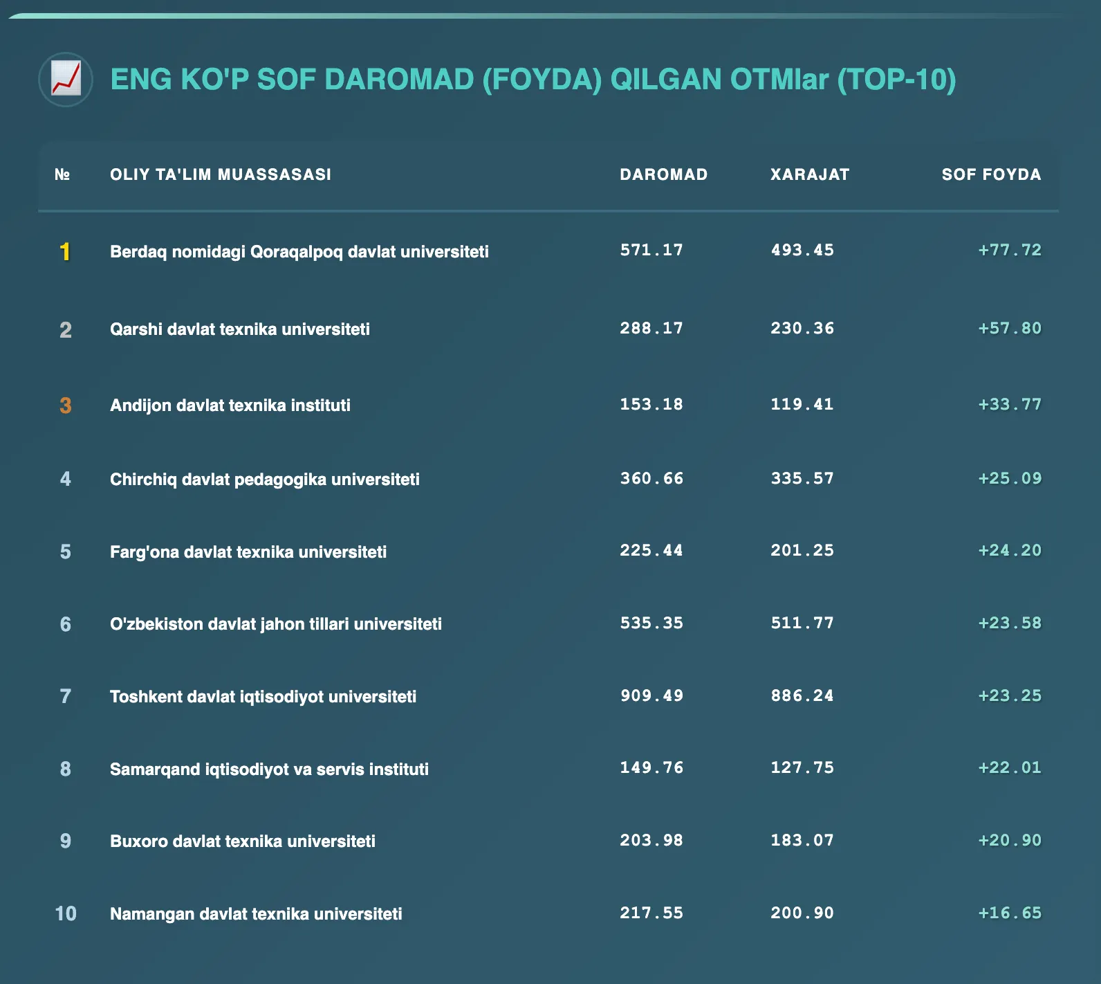 Молиявий самарадорлик нуқтаи назаридан қаралганда, энг катта соф фойда Бердақ номидаги Қорақалпоқ давлат университетида қайд этилган — 77,7 млрд сўм. Ундан кейин Қарши давлат техника университети (57,8 млрд сўм) ва Андижон давлат техника институти (33,8 млрд сўм) жойлашган.