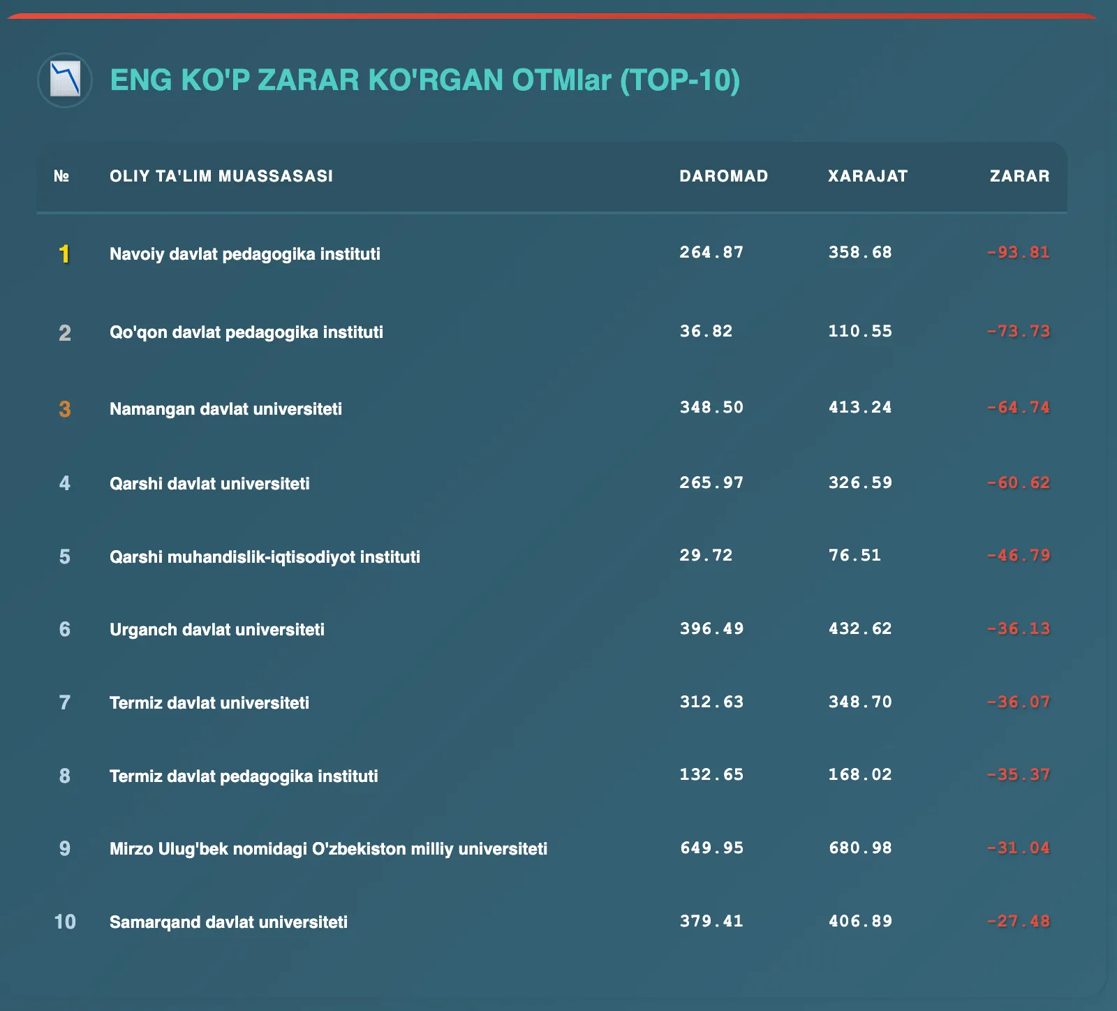 Бироқ айрим университетлар йилни зарар билан якунлаган. Энг катта манфий натижа Навоий давлат педагогика институтида кузатилган — 93,8 млрд сўм зарар. Шунингдек, Қўқон давлат педагогика институти (73,7 млрд сўм) ва Наманган давлат университети (64,7 млрд сўм) ҳам катта зарар қайд этган ОТМлар қаторида.