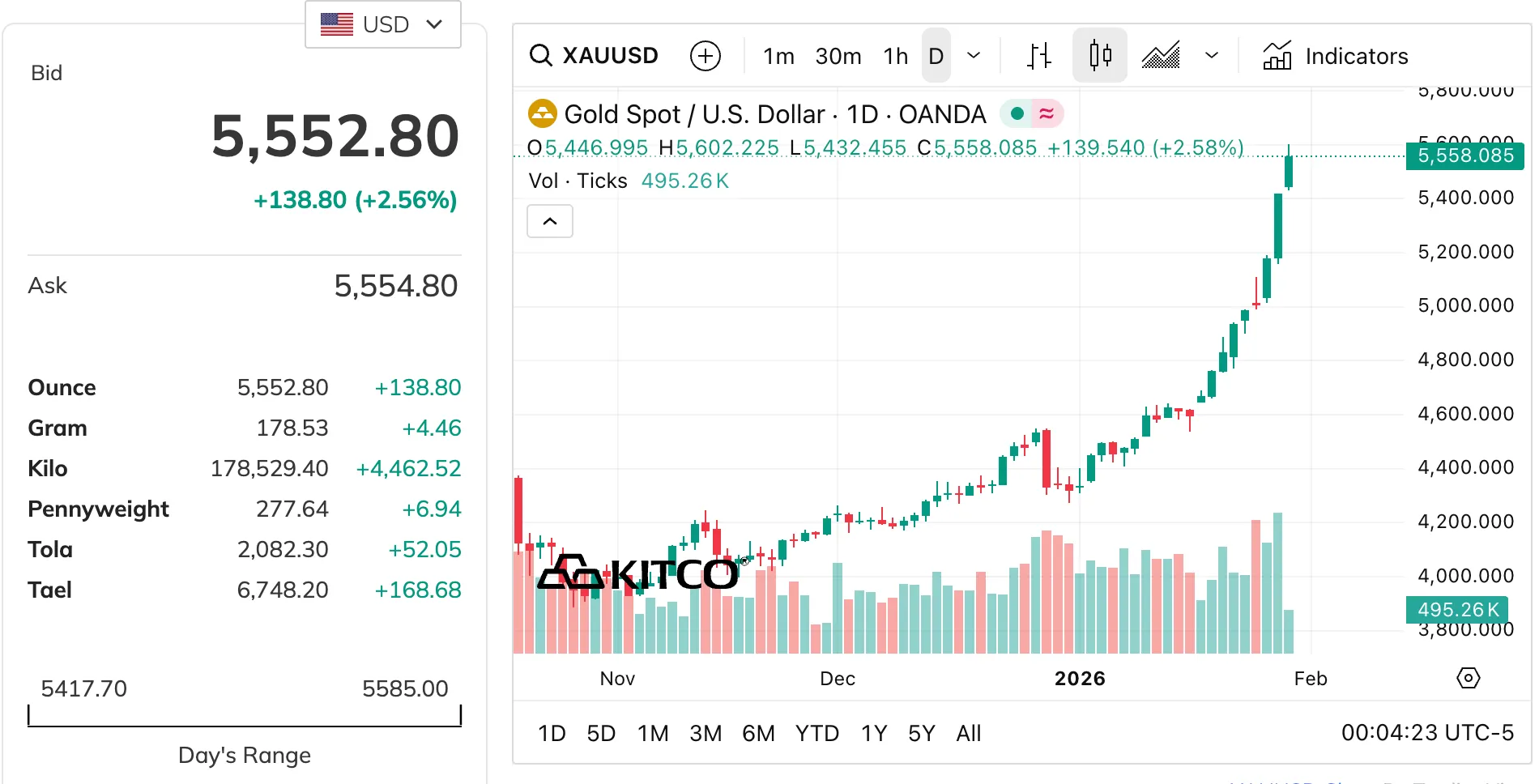 По данным платформы Kitco, в ходе торгов максимальная цена золота достигала 5 585 долларов. На момент подготовки сообщения унция золота торгуется по цене 5 552,8 доллара. Это означает, что цена одного грамма чистого золота составляет 178,6 доллара.