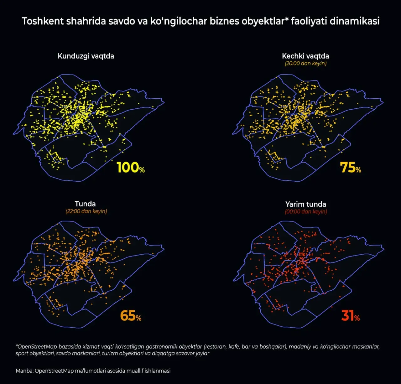 В таких районах, как Учтепа и Сергелий, уровень ночной активности значительно ниже по сравнению с другими районами, в результате чего эти территории превращаются в «спальные районы», предназначенные лишь для сна.