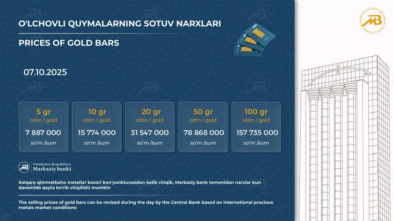 По состоянию на 7 сентября, цена за один грамм золота, установленная Центральным банком, составила 1 млн 577 тысяч сумов. Это рекорд, зафиксированный пятый день подряд. На мировом рынке спотовая цена на золото поднялась до $3 978 за унцию.