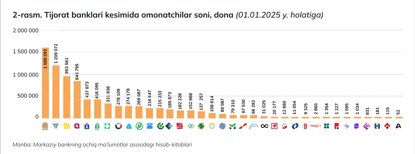 По данным Центрального банка, на долю двух крупнейших финансовых учреждений – Национального банка Узбекистана (1,6 млн вкладов) и Народного банка (1,2 млн вкладов) – приходится почти половина всех вкладчиков страны.