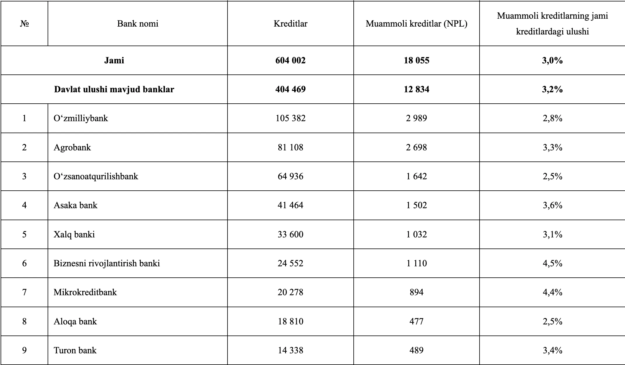 Davlat banklarida muammoli kreditlar hajmi yil boshiga nisbatan 1 trln 510 mlrd soʻmga kamaydi. 9 ta davlat bankining 6 tasida NP qisqargan boʻlsa, 3 tasida oshgan.