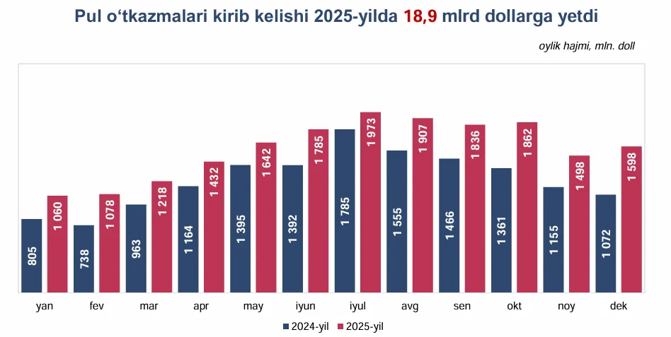 2025 yilning yanvar–dekabr oylarida chet eldan Oʻzbekistonga kelib tushgan pul oʻtkazmalari hajmi 18 mlrd 889 mln dollarni tashkil qildi. Bu oʻtgan yilning mos davriga nisbatan 27,2 foizga yoki 4,1 mlrd dollarga koʻproqdir.