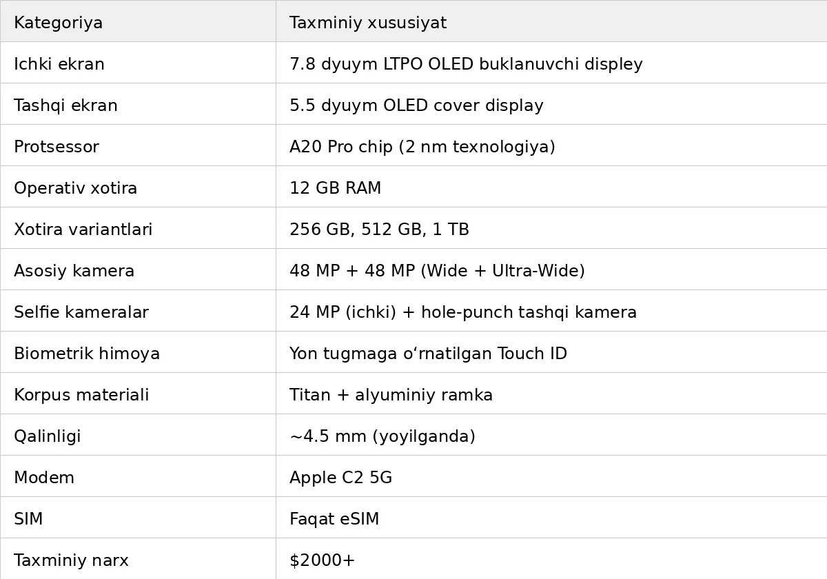 Taxminiy maʼlumotlarga koʻra, iPhone Fold 7,8 dyuymli ichki LTPO OLED buklanuvchi displey va 5,5 dyuymli tashqi ekran bilan jihozlanadi. Qurilmada yangi A20 Pro protsessori, kamida 12 GB operativ xotira, hamda titan va alyuminiy aralashmasidan tayyorlangan korpus boʻlishi mumkin. Shuningdek, telefon yoyilganda atigi 4,5 mm qalinlikka ega boʻlishi kutilmoqda, bu esa uni Apple tarixidagi eng yupqa qurilmalardan biriga aylantiradi.