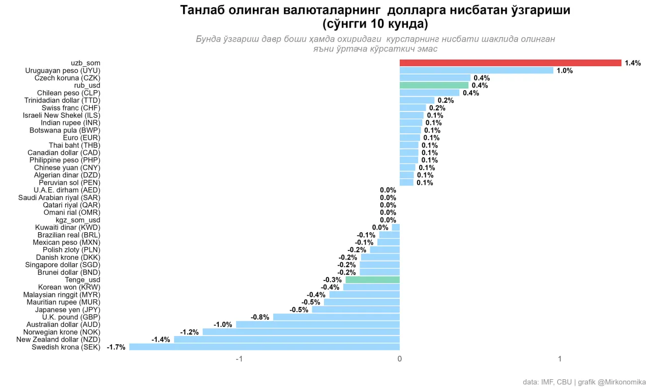 Umuman olganda, soʻnggi 10 kun ichida oʻzbek soʻmi dollarga nisbatan eng koʻp mustahkamlangan milliy valyutalardan biri boʻldi.