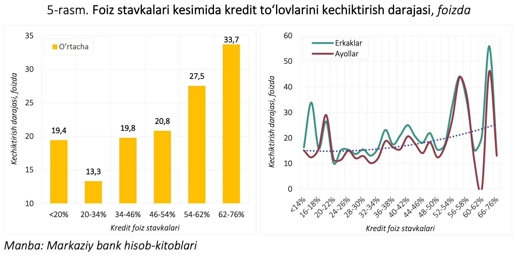 Markaziy bank oʻtkazgan tadqiqot ayollar kreditni erkaklarga nisbatan intizomliroq qaytarishini koʻrsatdi. Eng yuqori risk guruhi 20–30 yoshdagilar boʻlib, yuqori foizli va oʻrta muddatli kreditlarda kechikish darajasi keskin oshishi aniqlangan.