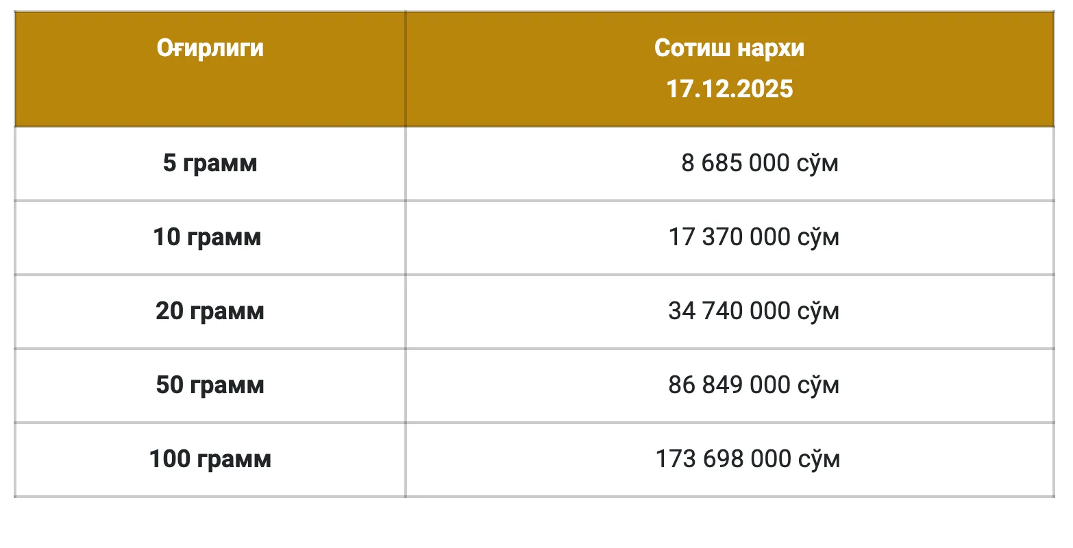 Ayni paytda Oʻzbekistonda oltin quymalari narxi quyidagicha boʻlib turibdi: