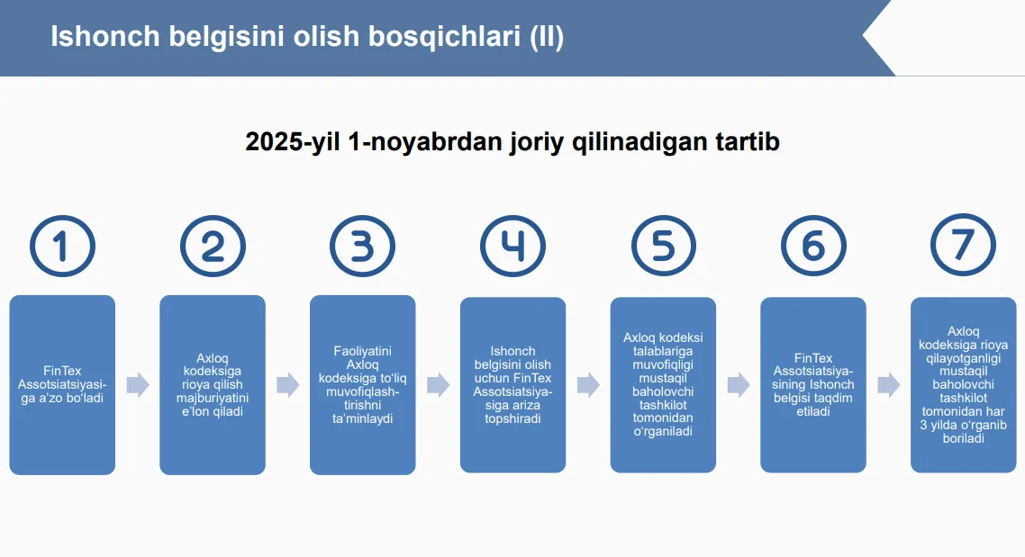 Loyihada “ishonch belgisi” egalari roʻyxatini FinTex assotsiatsiyasi oʻzining rasmiy saytida yuritishi belgilangan.