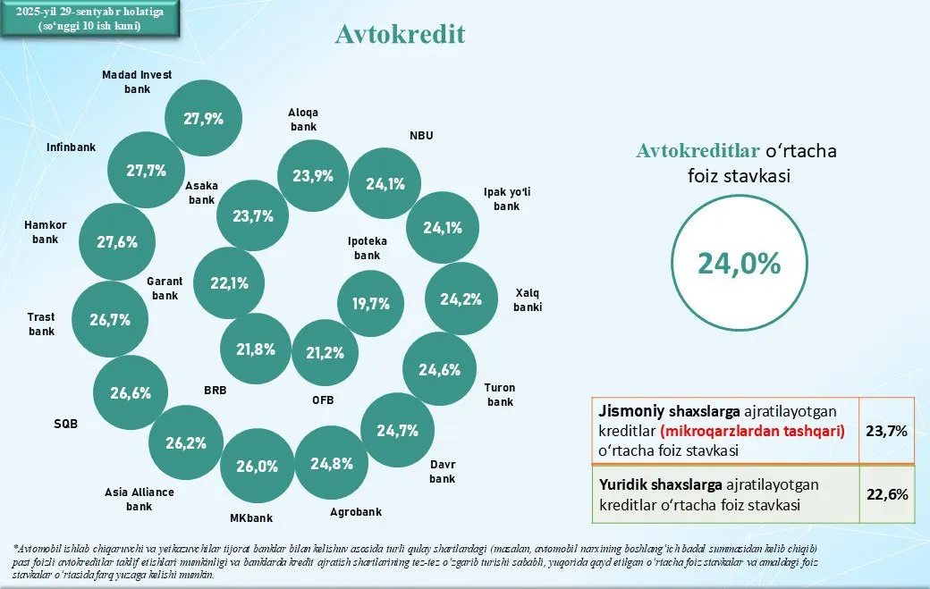 Avtokreditlar boʻyicha oʻrtacha foiz stavka hozirda 24 foizni tashkil qilmoqda. Bu oʻtgan oyga nisbatan 0,3 foiz yuqori.