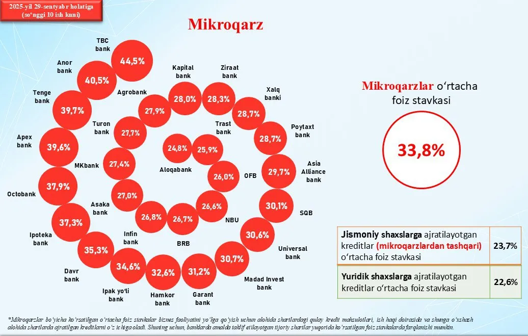 29 sentabr holatiga koʻra, mikroqarzlar boʻyicha banklar kesimidagi oʻrtacha foiz stavkasi kuzatuvlar boshlanganidan beri eng past darajaga — 33,8 foizgacha tushdi. Bu oʻtgan oyga nisbatan 2,1 foizga kam.