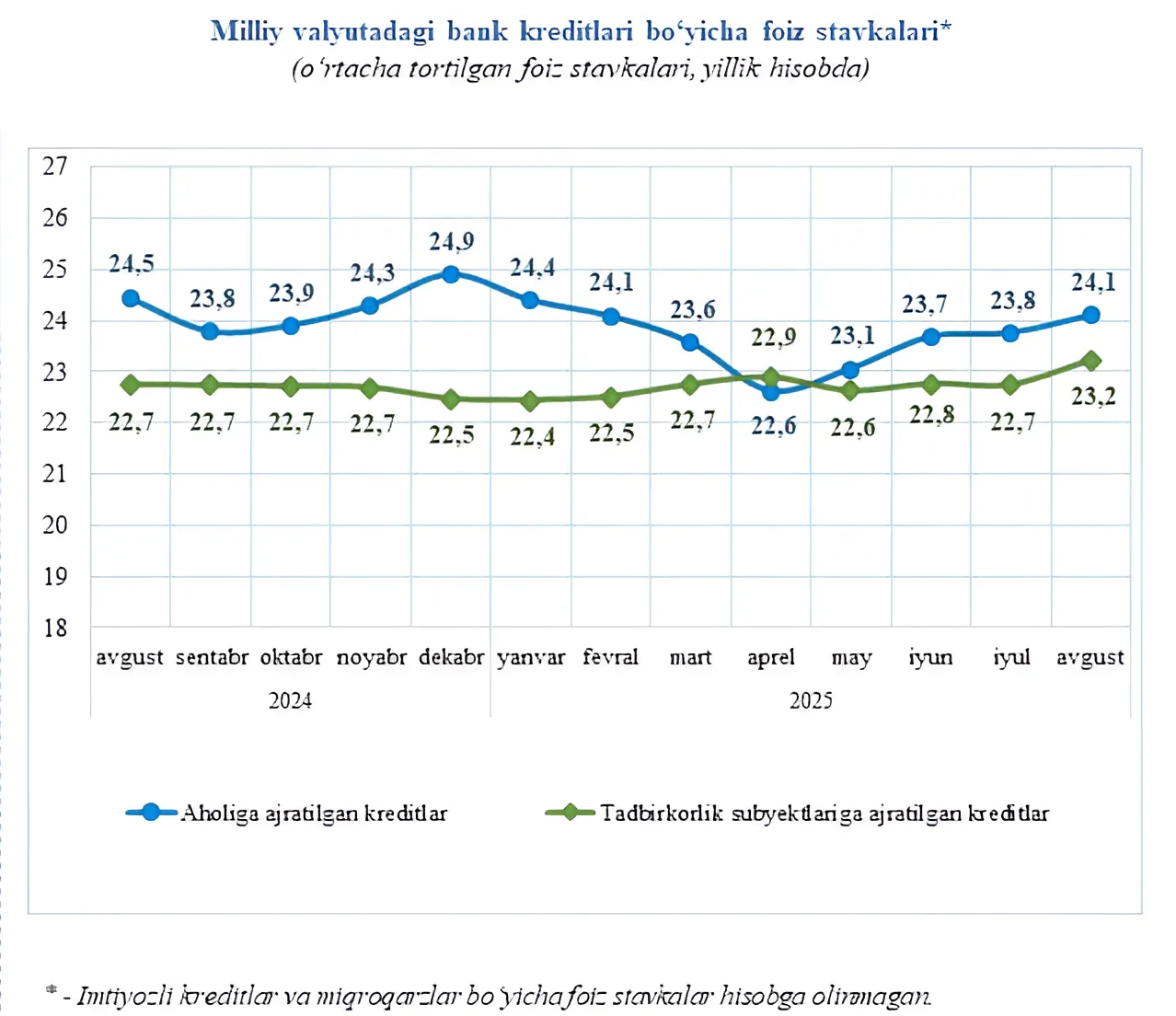 Oʻzbekistonda kreditlar boʻyicha oʻrtacha foiz stavkalari aprel oyidagi eng past darajadan soʻng ketma-ket toʻrt oy davomida oshib, avgust oyida 24,1 foizga yetdi.