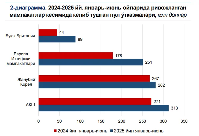 Xususan, quyidagi davlatlardan yuborilgan pul oʻtkazmalarida sezilarli oʻsish kuzatildi: