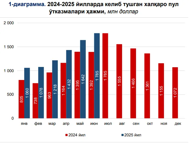 Markaziy bank maʼlumotlariga koʻra, 2025 yilning yanvar-iyun oylarida Oʻzbekistonga xorijdan yuborilgan pul oʻtkazmalari hajmi $8,2 milliardni tashkil etib, oʻtgan yilning shu davriga nisbatan 27 foizga oshgan. Bu mablagʻlarning katta qismi anʼanaviy ravishda Rossiyadan yuborilgan.
