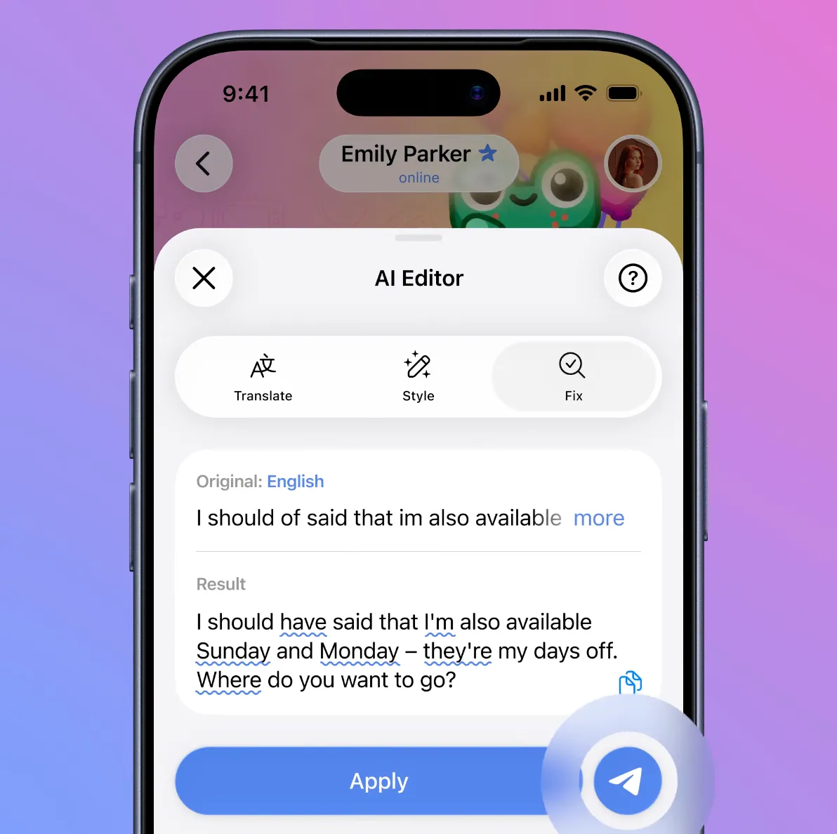 Telegram xabar yozish panelida endi ichki AI matn muharriri mavjud. U grammatikani darhol tuzatishi, matnni boshqa uslubda qayta yozishi yoki boshqa tilga tarjima qilishi mumkin. Bularning barchasi ochiq kodli AI modellar yordamida ishlaydi.