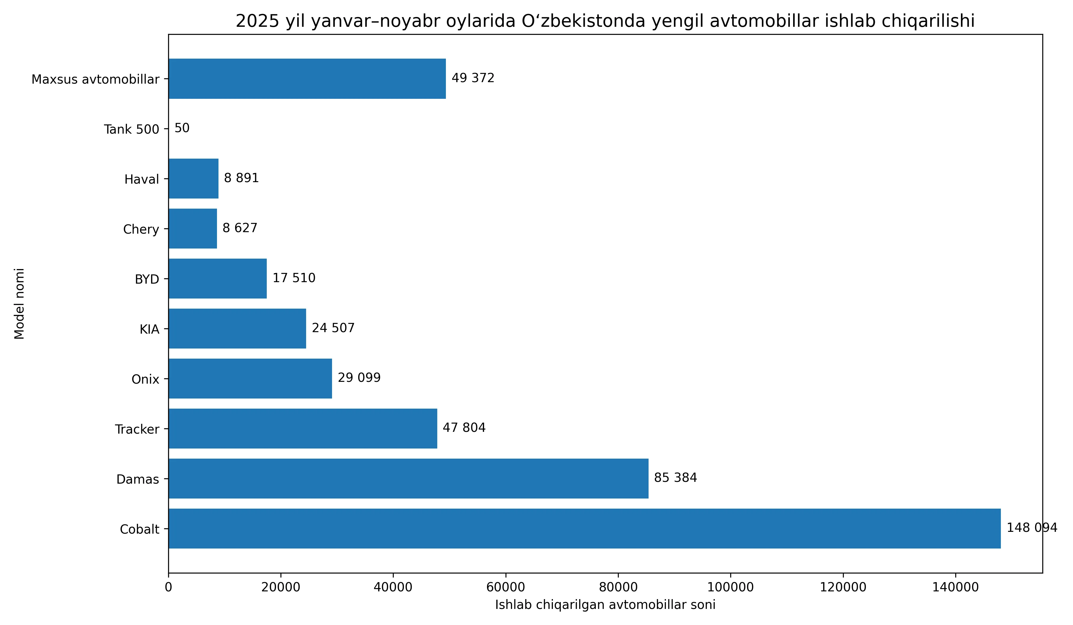 2025 yilning yanvar–noyabr oylarida Oʻzbekistonda jami 419 338 ta yengil avtomobil ishlab chiqarildi. Bu koʻrsatkich oʻtgan yilning mos davriga nisbatan 9,5 foizga yuqori. Bu haqda Milliy statistika qoʻmitasi maʼlum qildi.